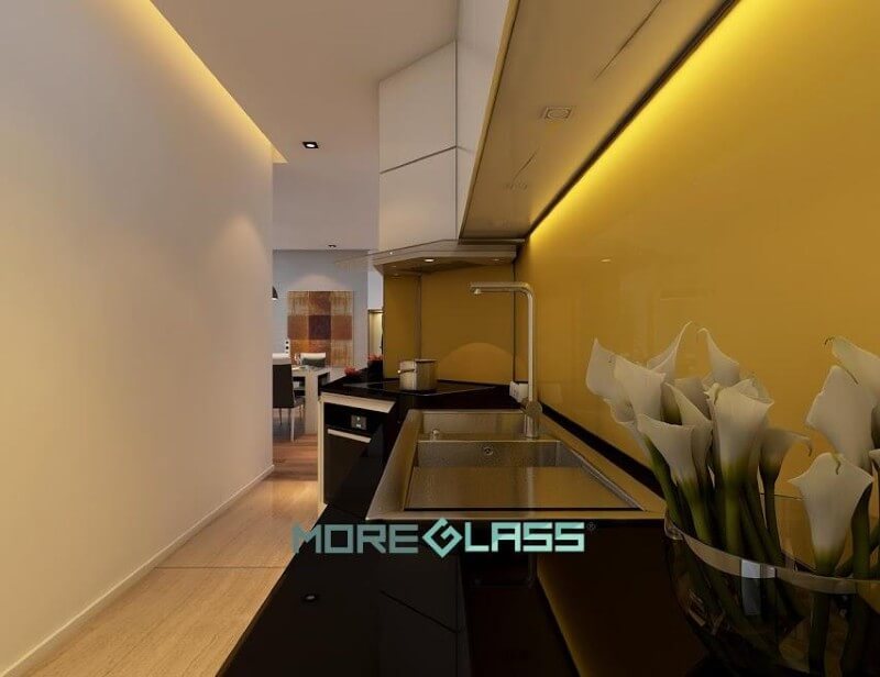 Trang trí mẫu kính ốp bếp màu vàng thư tươi tắn cho không gian phòng bếp thêm mới lạ đầy sức sống.