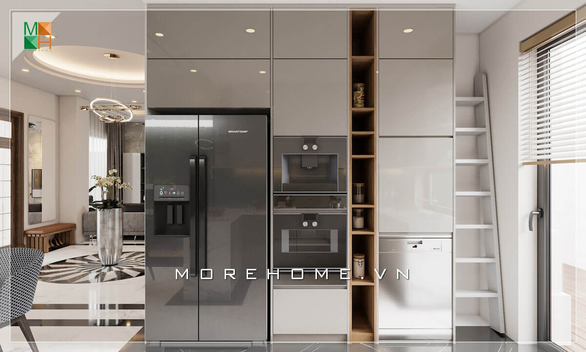 Sẽ là một gợi ý sáng tạo sẽ khiến bạn thích thú như trong mẫu thiết kế không gian bếp hiện đại biệt thự Vinhomes Imperia Hải Phòng trong đây, thiết kế kệ trang trí ở vị trí gần bàn ăn nhất giúp bạn lấy ly, chén một cách nhanh chóng.