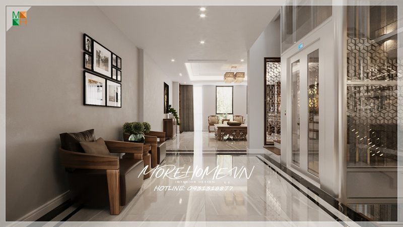 Bộ bàn ghế sofa gỗ óc chó được đặt ở vị trí hành lang giúp không gian thêm nổi bật và sang trọng hơn. Bộ bàn ghế sofa bao gồm 1 bàn và 2 ghế sofa đơn.