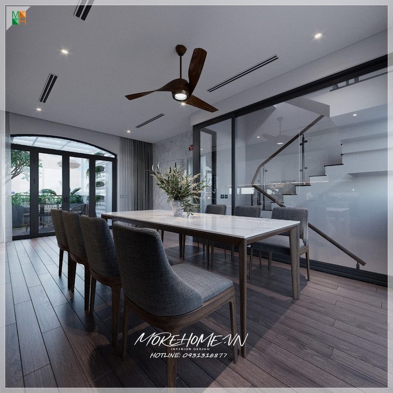 Bộ bàn 8 ghế bọc sofa có tựa chân gỗ kết hợp đá mặt bàn màu trắng cao cấp tạo cho không gian nơi đây thêm hiện đại tiện nghi