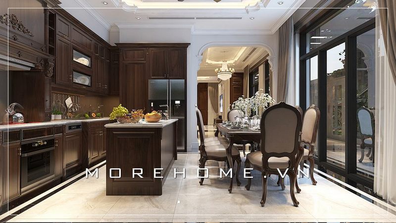 Thiết kế nội thất phòng ăn liền bếp tân cổ điển sang trọng cho nhà biệt thự