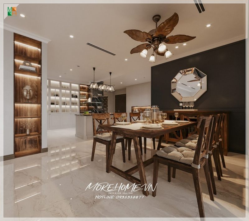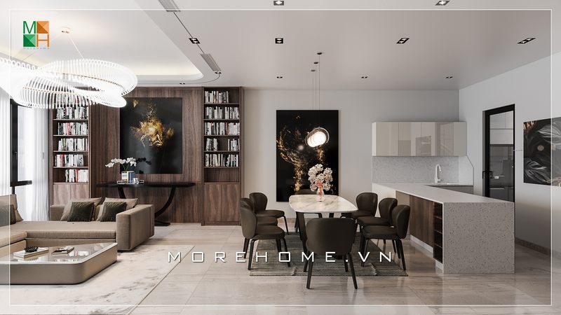 Với thiết kế xu hướng hiện đại phá cách thêm chút cổ điển việc thiết kế phòng ăn liền bếp đã giúp cho chung cư rộng rãi thoáng đãng mà giá trị thẩm mĩ cao.