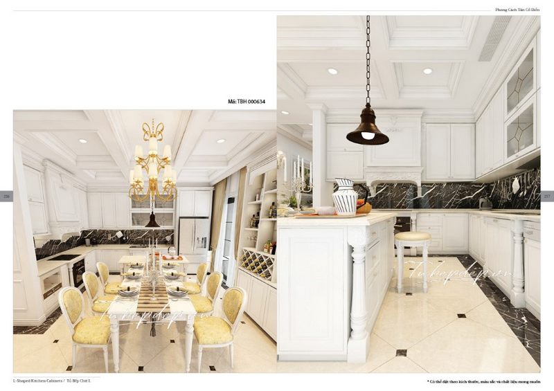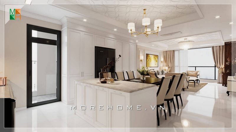 Thiết kế phòng ăn liền phòng bếp tạo sự gần gũi gắn kết giữa các không gian và cũng giúp tiết kiệm diện tích đáng kể, phù hợp cho biệt thự, nhà phố, chung cư cao cấp phong cách tân cổ điển.