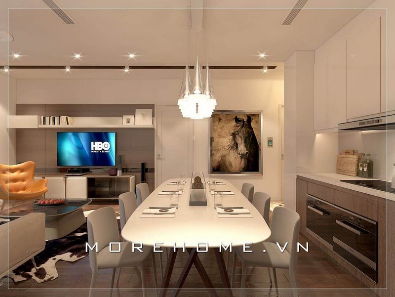 Tham khảo mẫu thiết kế nội thất hiện đại, có sự liên kết giữa các không gian sinh hoạt với nhau giữa phòng khách liền phòng ăn và bếp rất khoa học và tiện nghi phù hợp cho chung cư, nhà phố, biệt thự.