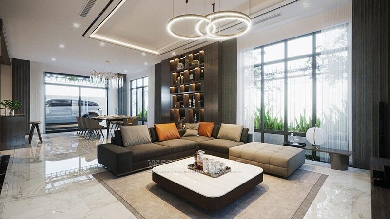 Thiết kế sofa theo phong cách hiện mà sang trọng đẳng cấp với vỏ bọc da tone nâu ấm áp kiểu dáng góc tiện lợi phù hợp với không gian rộng của phòng khách nhà phố, biệt thự.