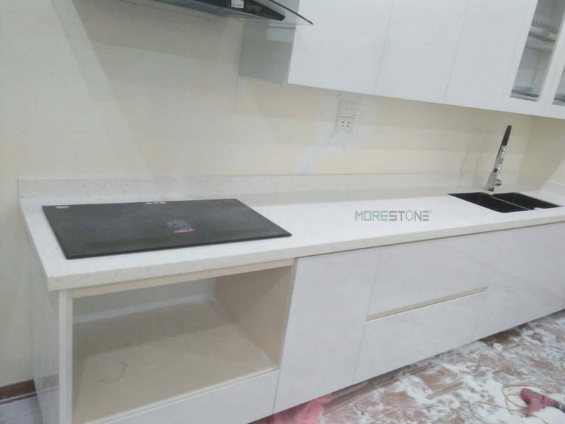 Bàn đảo bếp mặt đá màu trắng góp phần tô điểm thêm giá trị cho không gian sống của mỗi gia đình.