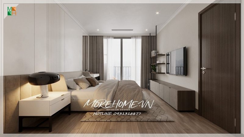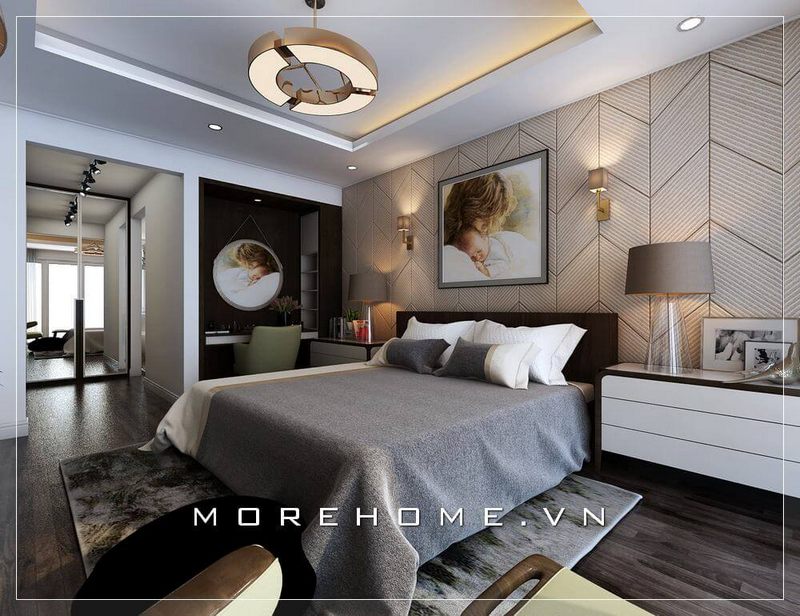 Nội thất phòng ngủ gỗ công nghiệp phong cách hiện đại, không cầu kỳ nhưng vẫn toát lên vẻ sang trọng với nội thất gỗ màu trung tính, tinh tế