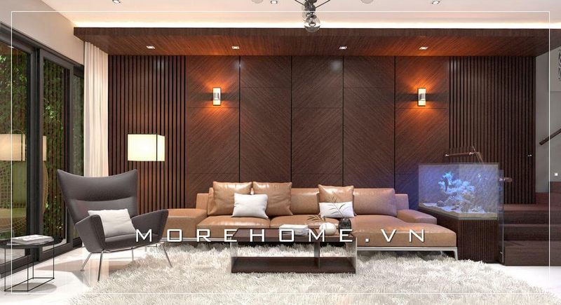 Nội thất phòng khách gỗ tự nhiên nhập khẩu, tone màu sáng được KTS lựa chọn chủ đạo giúp khắc phục được bài toán khó về diện tích không gian nhỏ