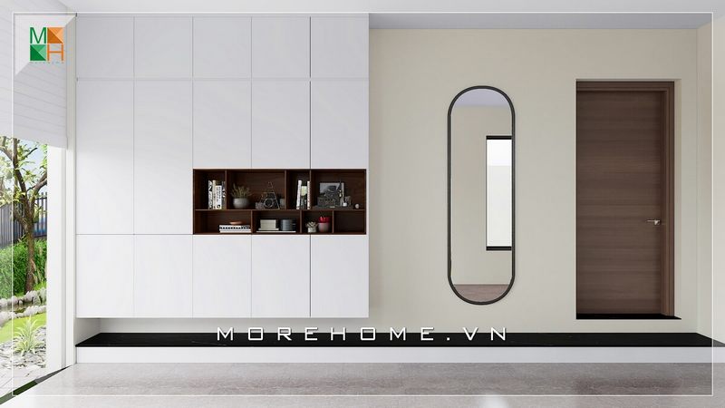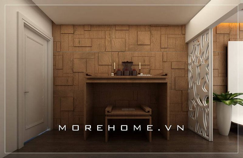 Không gian thờ cúng linh thiêng được kiến trúc sư đặt gọn gàng trong không gian sinh hoạt chung vừa đảm bảo phong thủy, vừa mang lại không gian thờ cúng trang trọng và thành kính của con cháu đối với người đã khuất trong gia đình