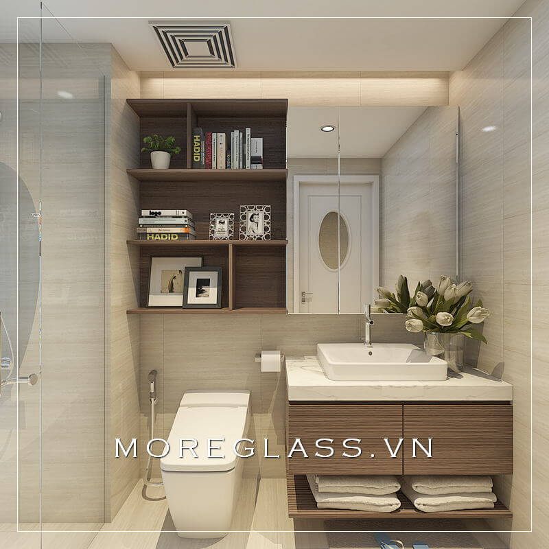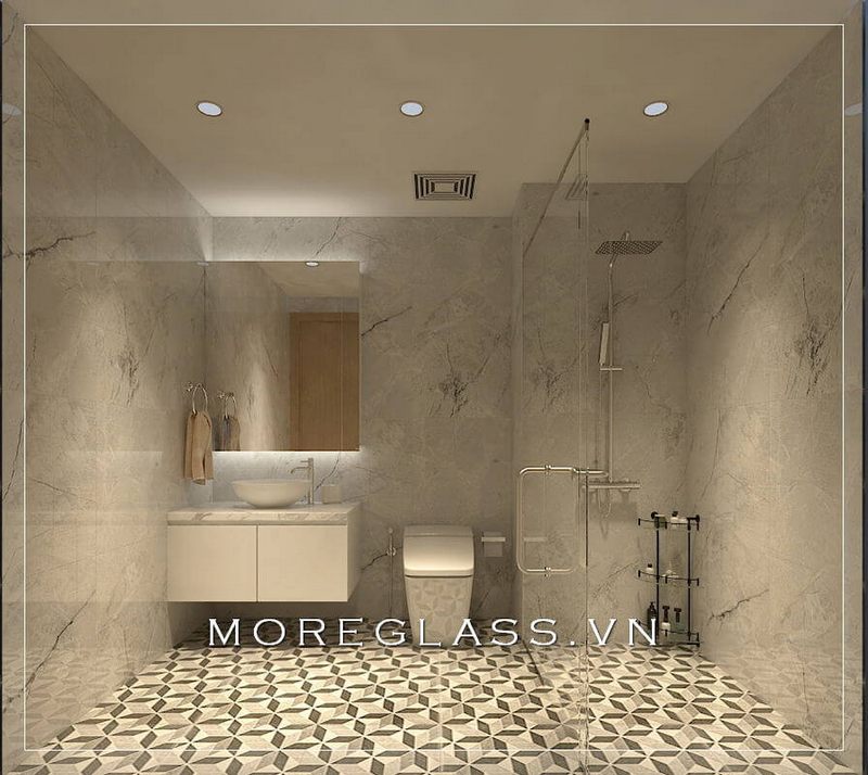 Ngoài việc bố trí phòng tắm hiện đại với vách kính ngăn rộng, còn sử dụng đá ốp tường trắng vân mây nhẹ nhàng thêm phần cao cấp, trẻ trung.