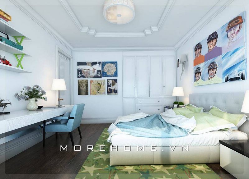 Thiết kế phòng ngủ hiện đại, đơn giản, tạo điểm nhấn ấn tượng hơn với tranh treo tường canvas ấn tượng cho thấy bé trai là một người vô cùng yêu thích thể thao, năng động