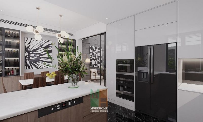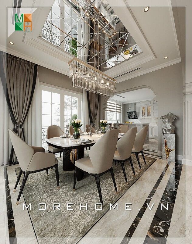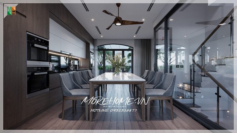 Thiết kế phòng ăn liền ngay phòng bếp tạo thành không gian mở thuận tiện trong sinh hoạt là ý tưởng độc đáo cho không gian biệt thự, nhà phố.