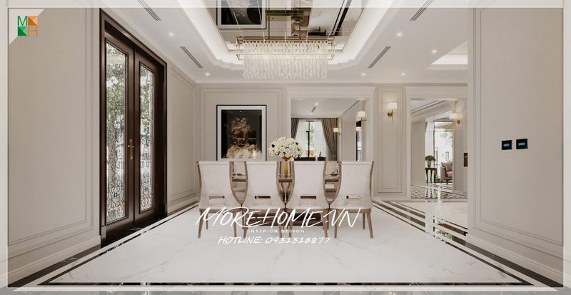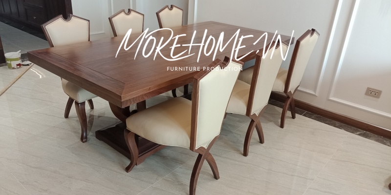 Mẫu thiết kế phòng ăn gỗ óc chó sang trọng, cao cấp cho chung cư, nhà phố, biệt thự tân cổ điển
