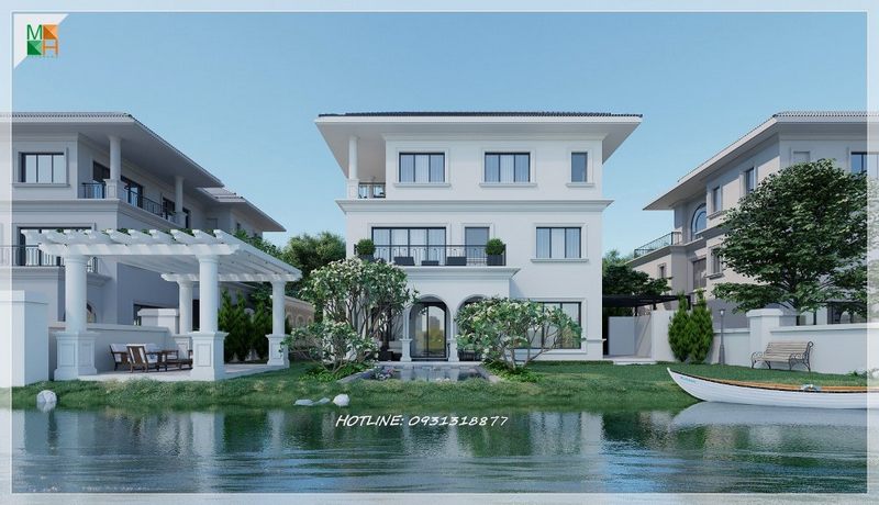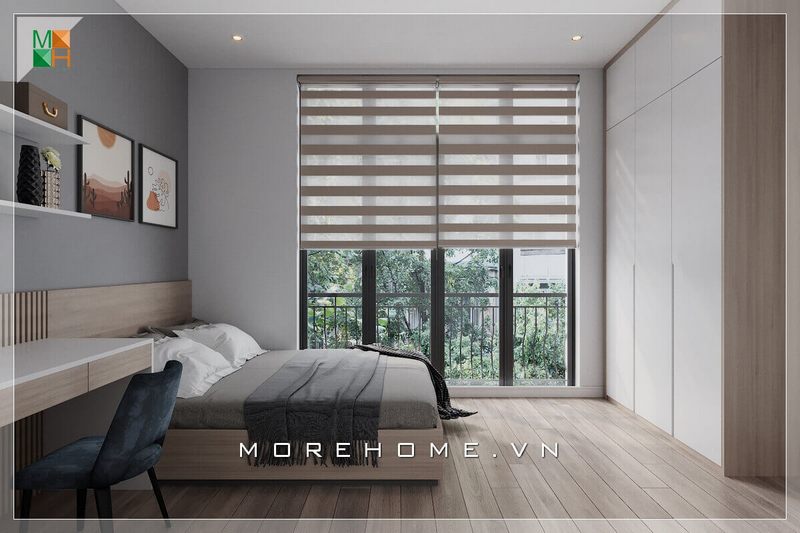Thiết kế phòng ngủ biệt thự hiện đại, phần cửa kính hướng ra sân vườn được làm với kích thước lớn giúp cho căn phòng thêm thông thoáng, tràn ngập ánh sáng tự nhiên