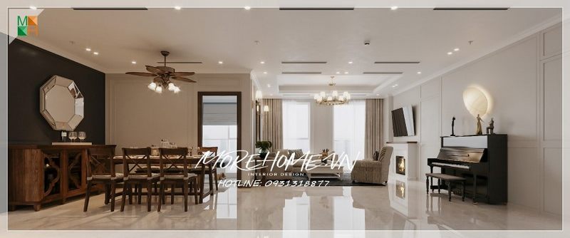 Thiết kế phòng khách liền bếp ăn sử dụng tone màu trắng chủ đạo đẹp cho căn hộ chung cư.