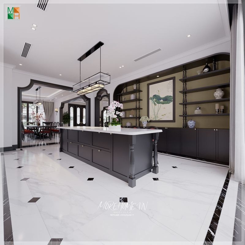 Bàn đảo bếp mang đến cảm giác phòng bếp rộng rãi, thoáng mát mỗi khi bước chân vào căn phòng.