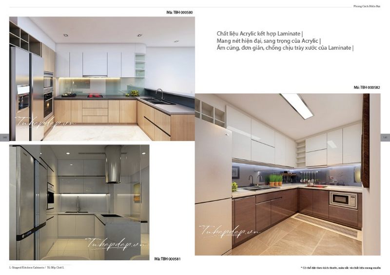 Hệ thống tủ bếp phân chia trên dưới 2 chất liệu laminate và acrylic tạo nên sự kết hợp hoàn hảo cho phòng bếp hiện đại