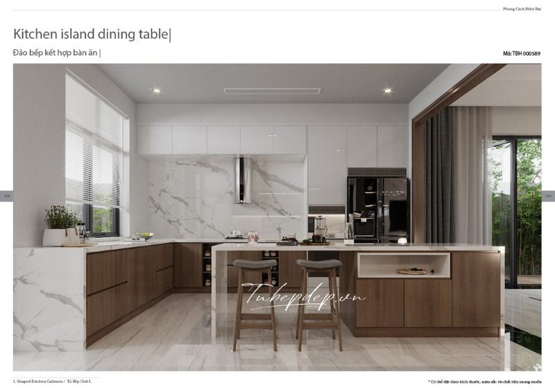 Mẫu bàn đảo bếp gỗ tự nhiên, mặt bàn ốp đá trắng cao cấp tạo nét sinh hoạt thuận tiện cho người nội trợ