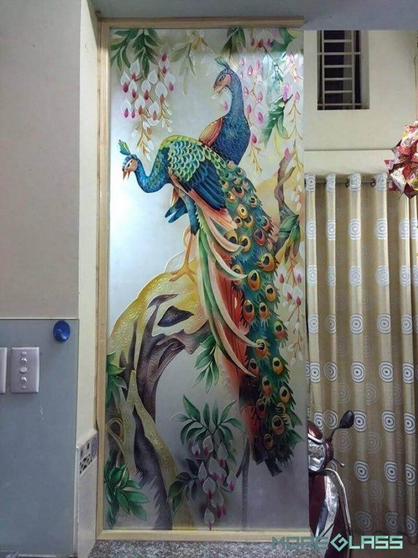 . Để giúp bạn có một phòng khách đẹp, mẫu vách kính được khắc 3D có hình ảnh hai chim công để mang lại sự may mắn và thịnh vượng cho gia chủ.