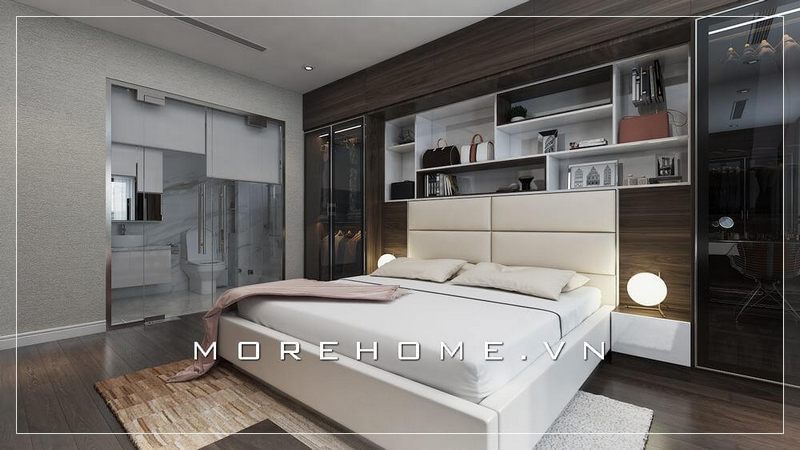 Nội thất phòng ngủ chung cư sang trọng, tiện nghi, chiếc giường gỗ công nghiệp màu trắng bọc da đầu giường tạo điểm nhấn lạ mắt cho cả không gian