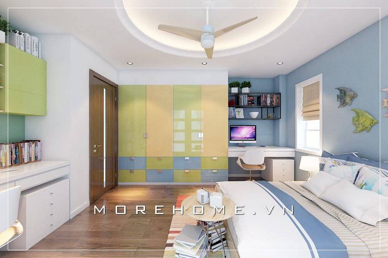Bàn học gỗ công nghiệp hiện đại được thiết kế để đặt gần cửa sổ căn phòng, giúp học sinh có thể sử dụng ánh sáng tự nhiên và tập tập hơn trong không gian học tập.