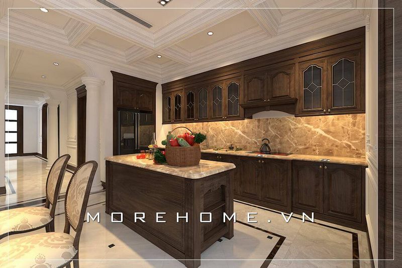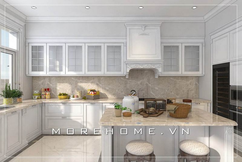 Tủ bếp biệt thự kiểu dáng chữ L tân cổ điển được thiết kế với những chi tiết tinh tế, đường ánh kim đơn giản để tạo nên điểm nhấn đặc biệt, mang lại vẻ đẹp mắt cho không gian nhà bếp.